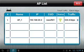 透過本程式可讓網路管理者能隨時隨地掌握AP的使用狀況,以便調整頻寬網路政策。 功能: Active User-目前尚在連線的設備列表與其使用流量。 24-Hour Log-在24小時之內曾經連線過的設備列表與其使用流量。 附註:本程式必須搭配AP控制器使用。